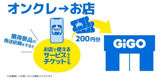 期間中、『GiGO ONLINE CRANE』にて獲得景品の発送依頼をいただいた方に、『GiGOのお店』で使える200円分のサービス券をプレゼントいたします。