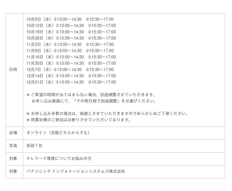 パナソニック インフォメーションシステムズ株式会社は、2022年10月5日(水)から2022年12月21日(水)にかけて各回1社限定の、VDI乗り換え・無料オンライン個別相談会を開催します。※好評につき期間延長しました。