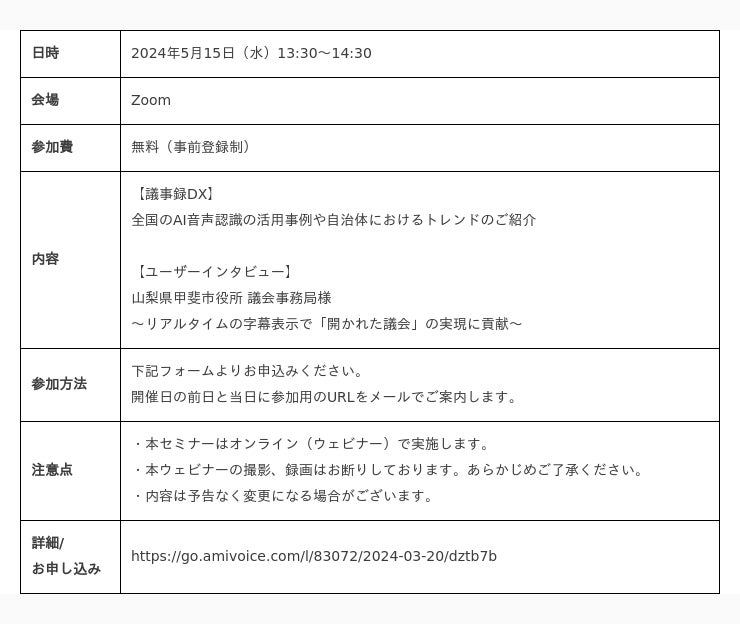 2024年5月15日(水)、株式会社アドバンスト・メディア(本社:東京都豊島区、代表取締役会長兼社長:鈴木清幸 以下、アドバンスト・メディア)は、オンラインセミナー「すぐにはじめられるAI活用で、住民も職員も嬉しいDX〜音声認識がもたらす自治体の新しい姿〜」を開催します。