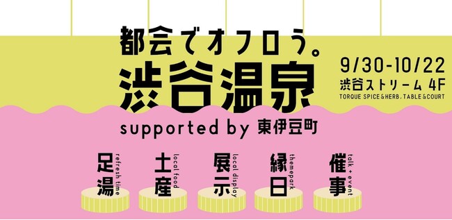 株式会社東急レクリエーション(本社:東京都渋谷区、代表:菅野信三)では、渋谷ストリーム内の直営事業所、サイクルカフェ「TORQUE SPICE & HERB, TABLE & COURT」(以降トルク)を会場に、東伊豆町と渋谷区を拠点とする株式会社micro developmentが企画する東伊豆町の魅力のひとつである温泉を通じてウェルビーイングな時間を都市居住者に提供するフェアを開催します。フェア開催期間は9月30日(土)から3週間、東伊豆町の特産物の物販や観光情報の発信、SNSを通じた情報発信を行います。10月21日(土)、22日(日)には東伊豆町の源泉を使った足湯を体験できるイベント、テーマにあわせたゲストトーク