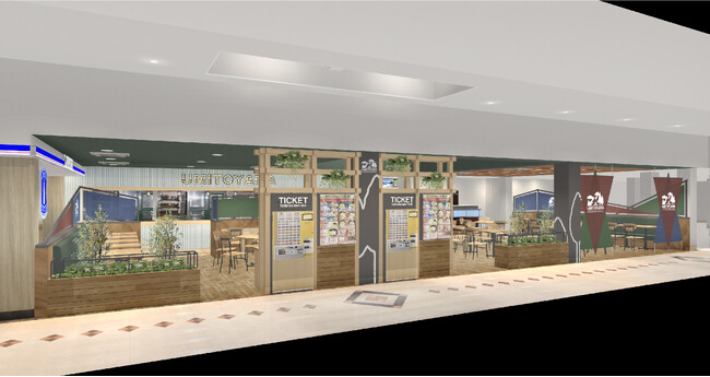 シンプルな昔ながらのフードコートから『木のぬくもり』+ 『自然を感じる』イメージに新たに生まれ変わります。近年 のキャンプブームや 2024 年開通の黒部宇奈月キャニオ ンルートに伴う登山を楽しむお客さまを想定し、ロッジ風の店舗づくりとなっています。フードコートは、ホテルの調理人による地元食材を使用したメニューをご提供します。