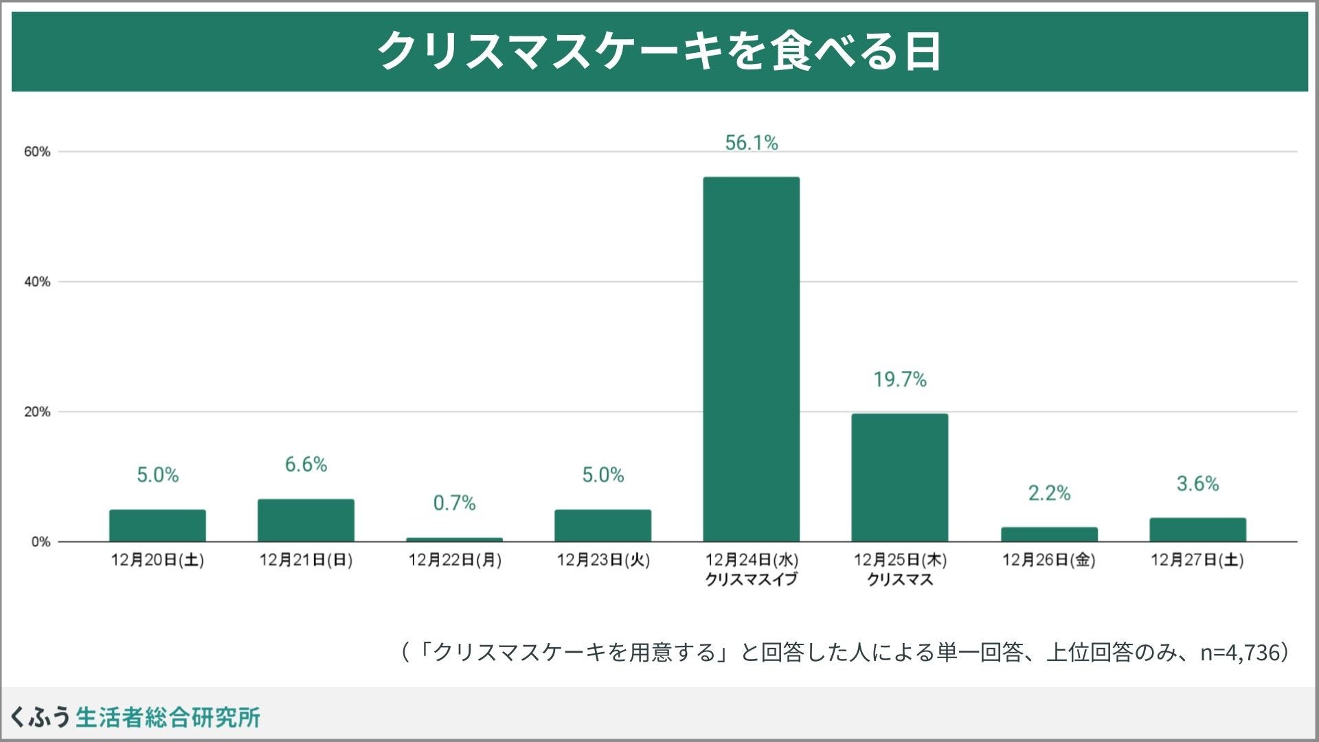 ケーキを食べる日は、約6割が「12月24日(水)クリスマスイブ」、約2割が「12月25日(木)クリスマス」と回答し、大半が平日のクリスマスを楽しむことがわかりました。ただし、一部の人は前後の週末に食べると回答しており、やや分散傾向にあることもわかります。
