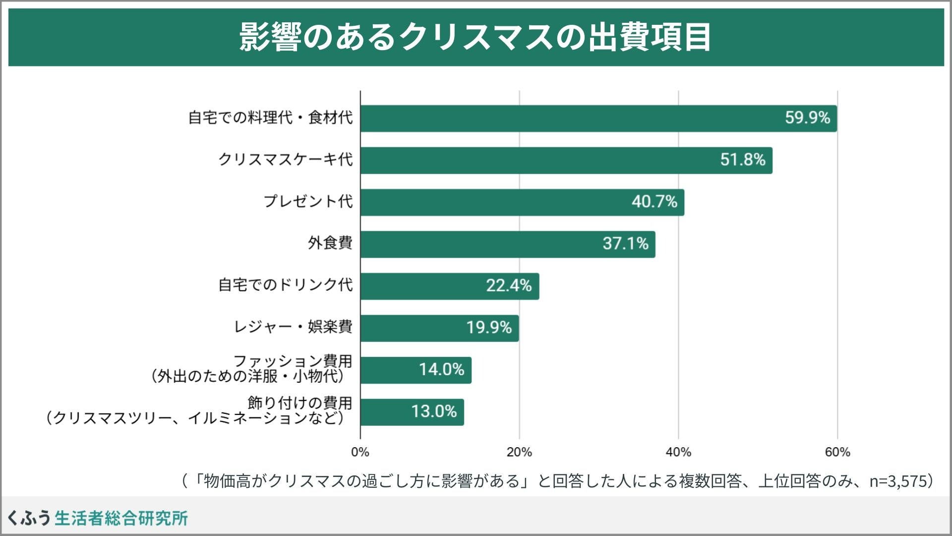 「影響がある」と回答した人に節約志向が影響しそうな支出項目を聞いたところ、自宅でのクリスマスの食卓に関する「料理代・食材代」(59.9%)、「クリスマスケーキ代」(51.8%)がどちらも半数を超えました。続く「プレゼント代」(40.7%)、「外食費」(37.1%)も約4割の人が影響があると回答しています。