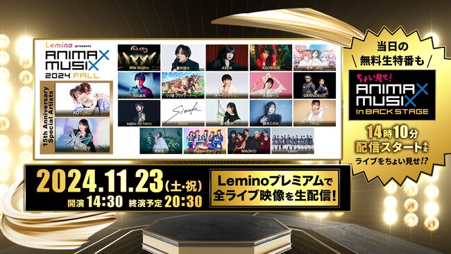 そして本日、会場で行われるアーティストの全ライブ映像をLeminoプレミアムにて独占生配信することが決定いたしました。KOTOKO、中川翔子、初出演の蒼井翔太やLiella!など注目のアーティストが出演する6時間越えの熱いライブをぜひ、配信でお楽しみください。当日はぜひハッシュタグ「#MUSIX15周年レミノで参戦」をつけて、皆さまの熱い歓声をお聞かせください!