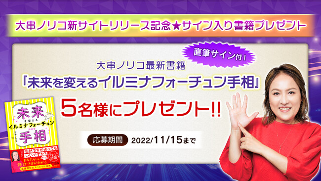 大串ノリコ先生の最新著書『未来を変えるイルミナフォーチュン手相』に先生の直筆サインを入れて、抽選で5名様にプレゼントいたします。この機会にふるってご応募ください。