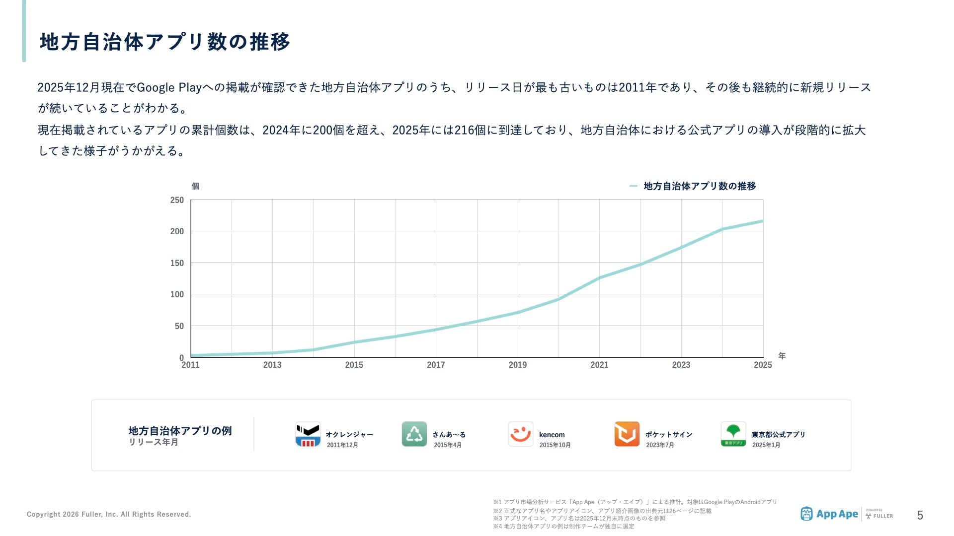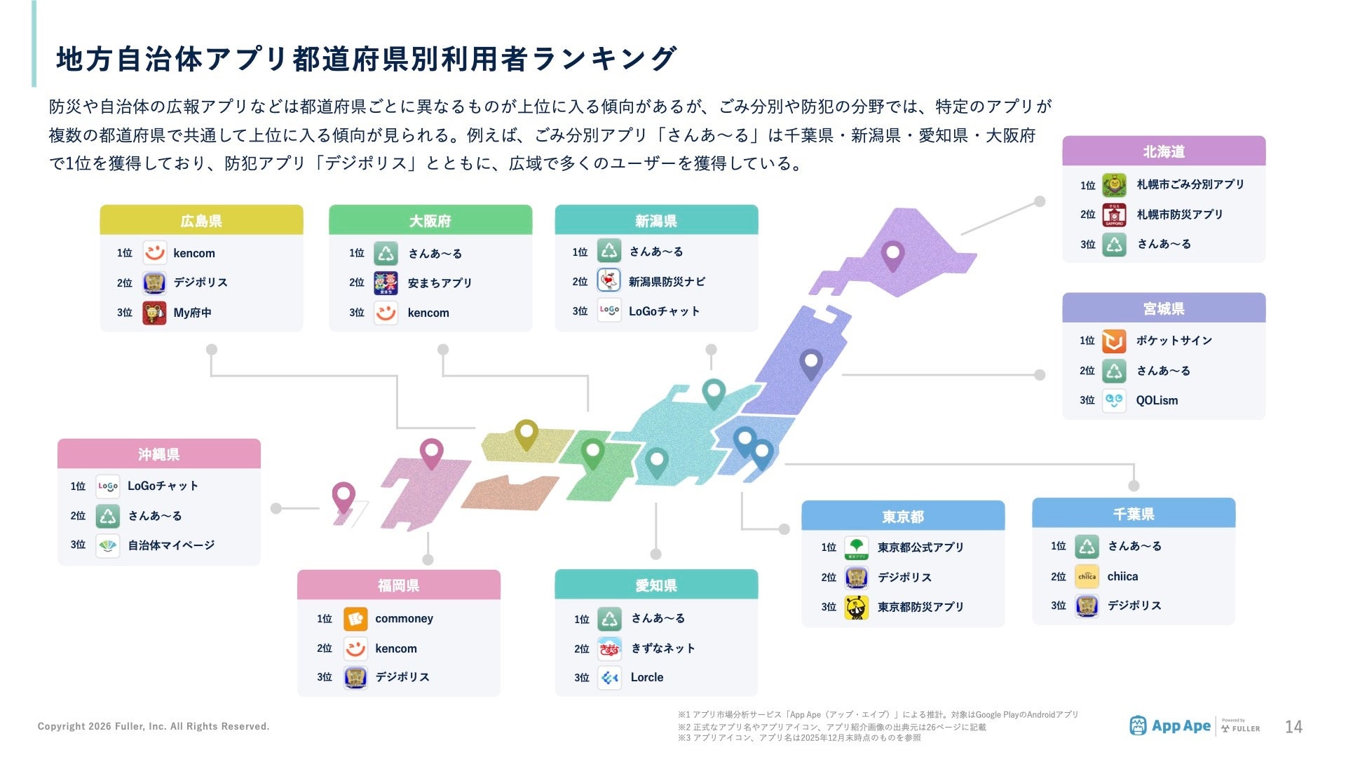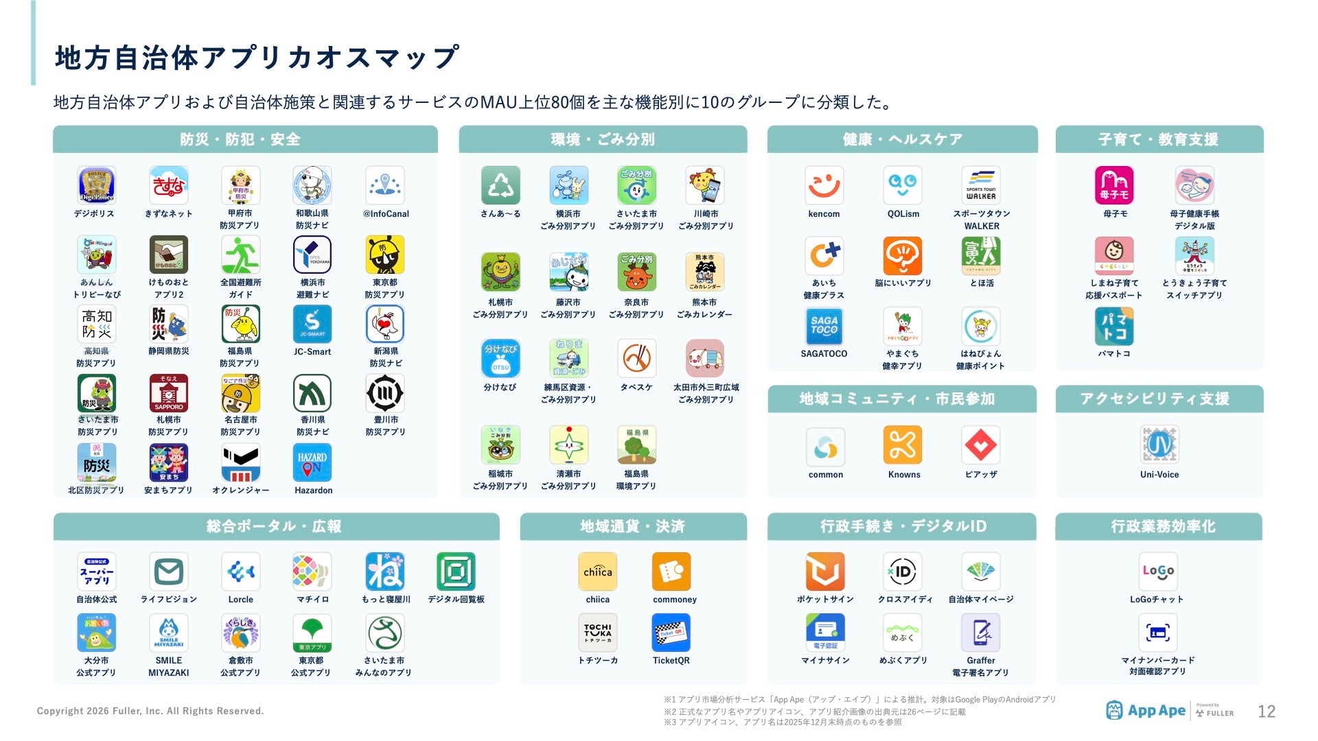 フラー株式会社(本社:新潟県新潟市、代表取締役社長:山崎将司、以下「フラー」)は、アプリ市場分析サービス「App Ape(アップ・エイプ)」に蓄積されたデータをもとに、地方自治体に関連するアプリの市場動向や利用実態をまとめた「地方自治体アプリ市場調査レポート2026」を公開しました。