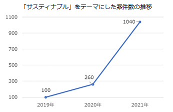 しかし、カーボンニュートラル分野は国内に前例がないケースも多く、企業から「知見がなく、何から着手すべきかわからない」「取り組みを推進したいが人材が不足している」などの声が多く聞かれます。こうした状況から、専門知識を持つプロ人材の活用が活発化。当社のサービス「i-common」では、「サスティナブル」に関連する案件数が2020年以降急増しています。2021年の相談件数も昨対比400%と企業ニーズの高まりが顕著に表れています(グラフ参照)。特に、カーボンニュートラルに関する知見やノウハウを持つプロ人材は引く手あまたで、中には一人で8件も集中する事態となっています。今後はさらにこの傾向が強まると考えられます。