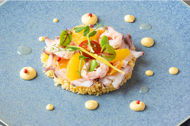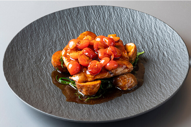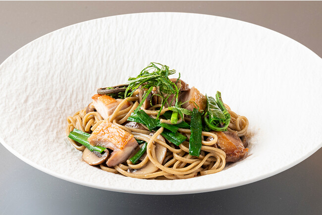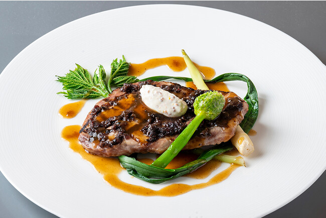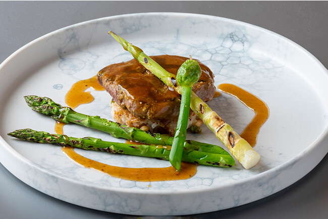 ディナーショートコースのメインは、山形県米沢市で飼育された銘柄豚「天元豚」。脂身の旨味とコクがありつつもさっぱりとした後味が特徴で、クランベリーピューレとオリーブをぬり、香ばしく焼き上げました。その他にも、庄内産のサクラマスや水だこ、山形県真室川町の地元農家によって受け継がれてきた伝統野菜など、前菜からデザートまで山形県の食材をふんだんに使用した料理が登場いたします。アラカルトでは、山形県が全国シェア7割を占め、日本一の生産地として知られる「さくらんぼ」を使用したパスタが登場。さくらんぼの優しい甘さの中に唐辛子のピリッとした辛さがあり、クセになる美味しさです。