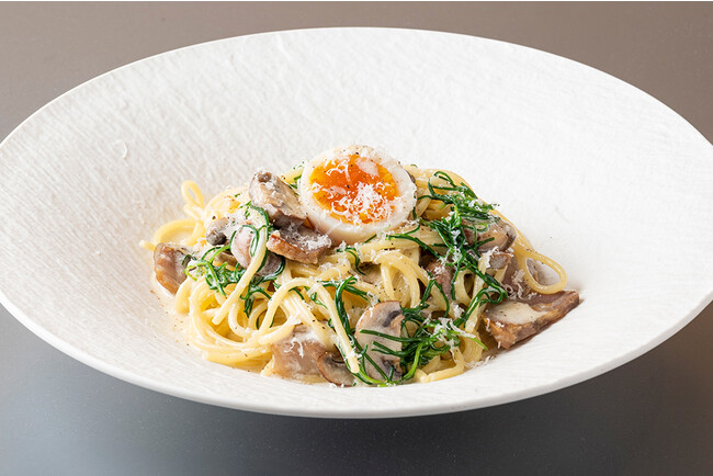 [内容] 山形さくらんぼ、モッツアレラ、ミニトマトのパスタ バジル風味 2,300 円/米沢の天元豚のパンチェッタと舟形マッシュルームのカルボナーラ スモッち卵とおかひじき添え 2,200 円/「さくらんぼ果汁を飲んで育った さくらんぼ鶏」と舟形マッシュルーム 大葉香る和風 月山そばパスタ リングイネ 2,000 円