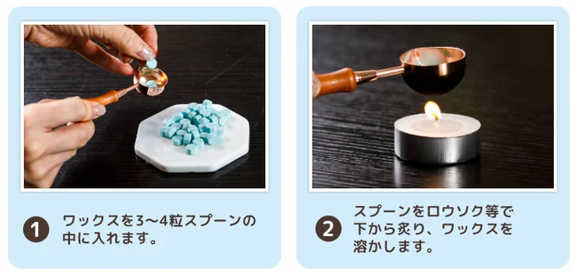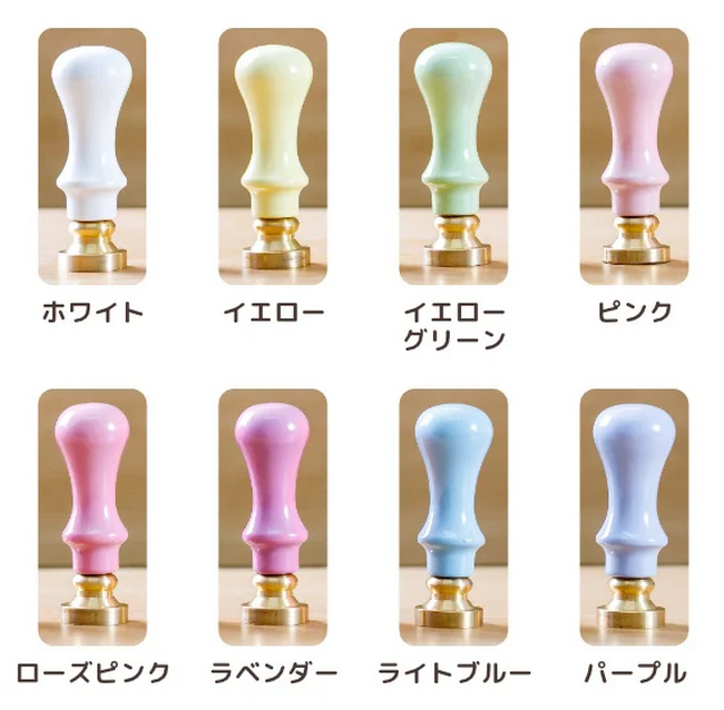 セットには、直径20ミリか25ミリが選べるシーリングスタンプの印面、パステルカラーの8色から選べるかわいいハンドルが各1個。さらに14色から選べるワックスが50粒、ワックスを熱するためのスプーンが付属します。