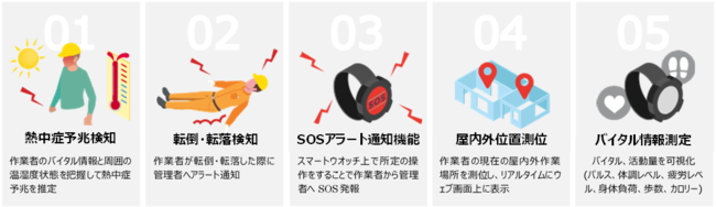 転倒・転落や各種体調変化のリアルタイム検知に加え、バイタルや活動量データから熱中症予兆や注意力低下などの「危険予知」を行い、労災事故の「未然予防」を目指す