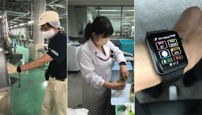 キリンビール神戸工場、キリンディスティラリー富士御殿場蒸溜所では、2021年7月〜10月にかけて実証実験を実施し、1工場あたり6名が業務時間内にスマートウォッチを着用し、「Work Mate」の「転倒検知」「健康検知(熱中症予兆検知、体調変化の検知)」「操作性」の3項目の検証をしました。