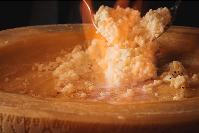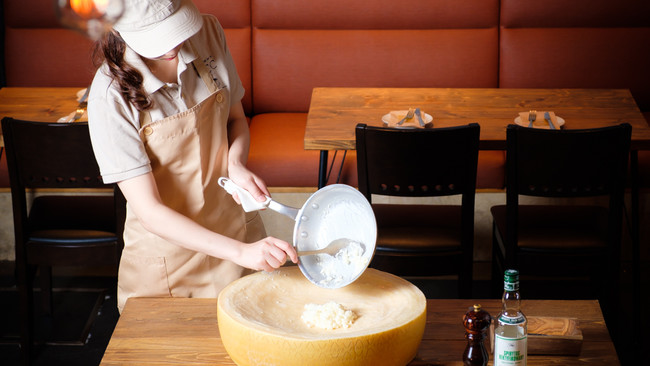 20kgのハードチーズ・グラナパダーノチーズをダイナミックに削りながら作るチーズリゾットや、まるでメロンのような見た目のミモレットチーズを丸ごとくり抜いて作ったボウルで仕上げる、チーズの香り豊かな「特製のカルボナーラ」など、チーズ専門店ならではの味をご用意いたしました。お客様の目の前で仕上げることにより、出来たての美味しさを五感で楽しんでいただける商品になっております。