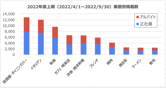 飲食店専門の求人情報サイト「求人@飲食店.COM(https://job.inshokuten.com/)」を運営する株式会社シンクロ・フード(本社:東京都渋谷区、代表取締役:藤代真一、東証プライム市場:3963)は、求人@飲食店.COMに登録された2022年度上期における飲食店の職種別・業態別求人データを発表します。