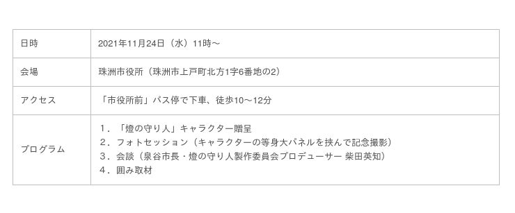 燈の守り人キャラクターを活用して、地域の灯台を歴史・文化資産として活用する機運をつくるため、キャラクター化の対象となる「禄剛埼灯台」が立地している石川県珠洲市の泉谷満寿裕市長を、「燈の守り人」製作委員会プロデューサーの柴田英知が2021年11月24日(水)に表敬訪問し、キャラクターの贈呈式を実施しました。