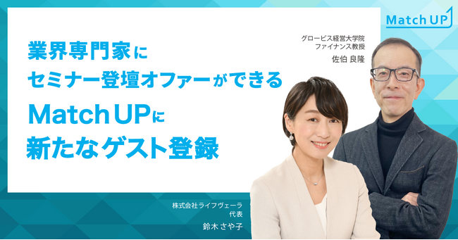 業界専門家にセミナー登壇オファーができる「Match UP」グロービス経営大学院 佐伯 良隆氏、株式会社ライフヴェーラ 鈴木 さや子氏が新たにゲスト登録