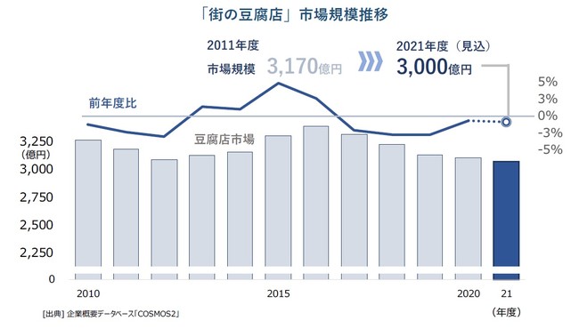 帝国データバンクが国内の豆腐製造・販売業者を対象に調査した結果、2021年度の、「街の豆腐店」市場(事業者売上高ベース)は約3000億円規模に達することが分かった。市場は16年度をピークに5年連続で減少を続けるものの、減少ペースはコロナ禍の20年度以降は小幅にとどまった。外食向けなどの販売量は低調に推移した一方で、巣ごもりによる自炊機会の増加から家庭向けが好調だった。なかでも「低脂質・高タンパク」といった健康食品としての新たな付加価値創出により、「プロテインバーなど新タイプの豆腐製品が好調」といった理由から増収につながった豆腐店もみられた。
