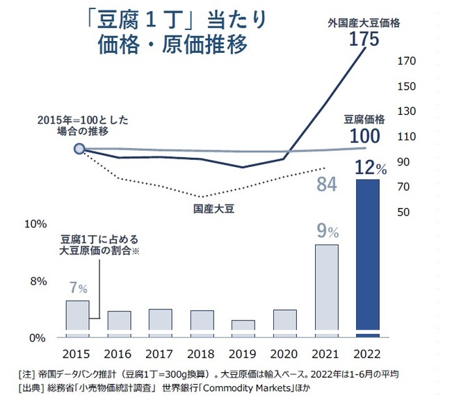 背景には、豆腐の原材料である大豆価格が急上昇している点がある。国産大豆は近年の収穫量減少が影響しているほか、輸入大豆ではウクライナ危機に伴う需給逼迫に加え、中国などの大豆輸入量増加で国際市況は高止まりが続くなどの影響に加え、急速に進んだ円安も重なって価格が押し上げられている。帝国データバンクが推計した1kg当たりの外国産大豆価格は、2022年は15年から75%上昇、前年からも3割増加した。一方、豆腐の平均単価はほぼ変化がなく、22年も豆腐1丁(300g)あたり平均60〜70円と、15年の水準からほぼ横ばいで推移している。
