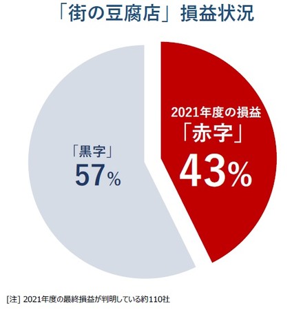 他方、損益面では苦戦が続いている。2021年度の損益が判明した豆腐店のうち、赤字の割合は42%に達し、前年度(47%)に続き2年連続で赤字の割合が4割台となった。主原料となる大豆、特に米国・カナダ産大豆の仕入価格が高騰したことで調達コストが大幅に膨らんだ一方で、スーパー向けなどでは販売価格に十分な転嫁ができず、赤字に転落するといった事例も散見された。