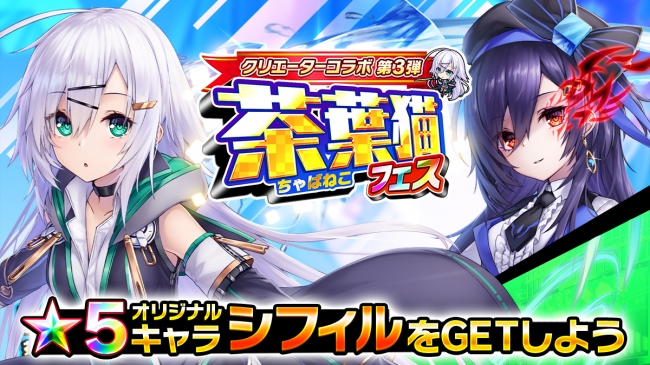 クリエイターズコラボの開催を記念して「茶葉猫フェスガチャ」が期間限定で提供されます。茶葉猫先生が描いた新★5キャラクターが初登場します。該当の★5キャラクターは、同レアリティの他キャラクターと比べ出現率がアップ(注1)しています。
