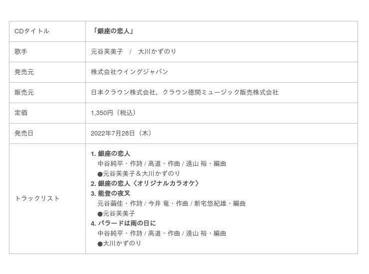元谷芙美子&大川かずのり 新曲 「銀座の恋人」 本日7月28日CD発売