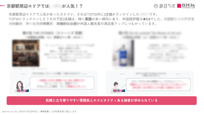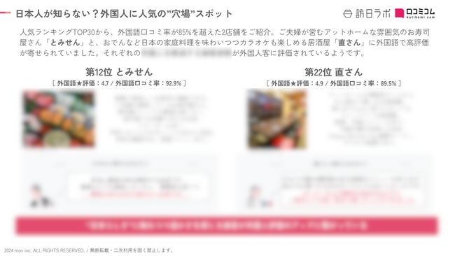 国内最大級のインバウンド総合メディア「訪日ラボ」及び 口コミサイトを”もっと”売上に変える店舗支援SaaS「口コミコム」を運営する株式会社mov(代表取締役:渡邊 誠、本社:東京都渋谷区、以下mov)は、各地の飲食店に寄せられた最新の口コミデータから、独自の『インバウンド人気飲食店ランキング』を発表しました。