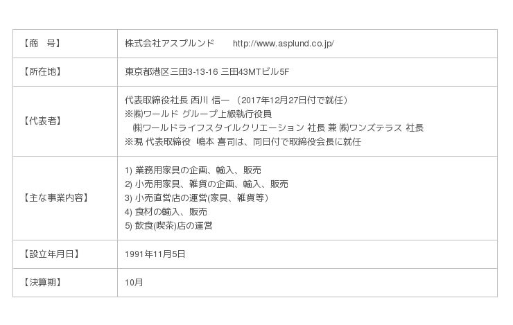 アスプルンド社の家具・インテリア、およびキッチン雑貨事業は、WLC社の事業とも親和性が高く、今般の株式取得により、ワールドグループに迎え入れることで、新たなカテゴリーが加わるとともに、両社がこれまで培ってきた独自の価値観と見識を活かした事業ノウハウ及びプラットフォームを存分に活用し、ライフスタイルビジネスの充実と事業の更なる成長を目指してまいります。