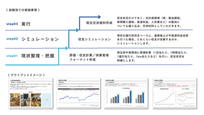 交渉の成功率を高めるため、1.現状整理・把握、2.シミュレーション、3.実行 の3フェーズに分けて、荷主交渉をサポートします。