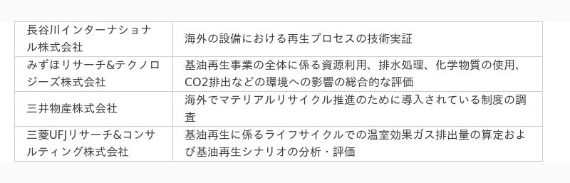 本事業では、日本に適した潤滑油の再生プロセスの検討と、プロセス毎の環境への影響を評価します。加えて、使用済み潤滑油の再利用方法をサーマルリサイクルからマテリアルリサイクルへ円滑に転換するために必要な制度を検討します。