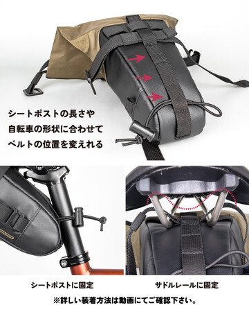 サドルバッグ、バックル式ストラップ、弾力紐付き調整固定用金具