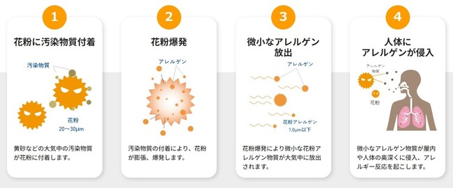 花粉症とは花粉の中のアレルゲン物質が原因で引き起こされるアレルギー反応です。特に都市部では以下の4つのステップにより花粉症が引き起こされ、花粉アレルゲンの粒子はPM2.5よりも小さく、空気清浄機や第1種換気※3、マスクなどで謳われている「PM2.5対応フィルター」もすり抜け、体の中に侵入しアレルギー反応を起こします。
