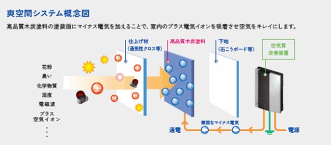 「爽空間」は、木炭の特性を活かして快適な室内環境をつくり出すシステムです。木炭を極限まで粉末にして多孔質な表面積を拡大し、特殊な樹脂で液状にした高品質木炭塗料「液状活性触媒炭」を室内の壁や天井に塗布します。そこに、「空気質改善装置」を使って微弱電流を流し、マイナス帯電化させることで、空気中の有害化学物質や花粉症の原因となるアレルゲン物質等の微粒子をひきつけます。その結果、マイナスイオン優位な空気環境がつくられ、森林浴効果に近い癒しや心地よさ、あるいは快眠や健康促進に期待ができる住空間に生まれ変わります。