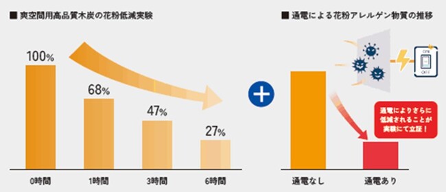 2018年より花粉症原因物質研究の第一人者である王青躍教授と、花粉アレルゲン物質(抗原)に対する「爽空間」の効果について共同研究を行ってきました。その結果、爽空間の素材である高品質木炭を塗布し、通電させることで、通電しない状態より花粉アレルゲン物質をより低減することを確認しました。この内容は2022年度の日本花粉学会で、王青躍教授より発表されました。