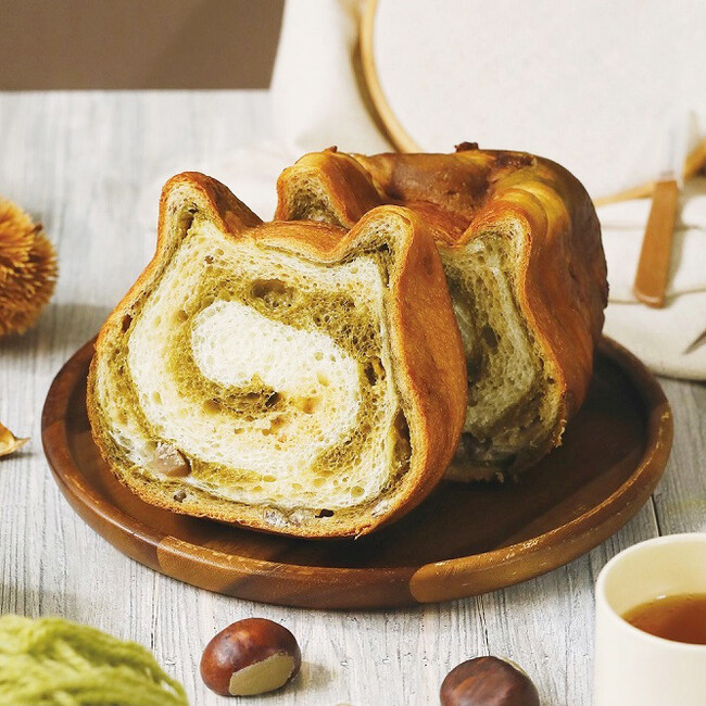 ほうじ茶の香ばしさと優しい苦みが、栗やホワイトチョコの甘さをより引き立て、栗とほうじ茶の絶妙なハーモニーをお楽しみいただける秋にぴったりなねこねこ食パン。