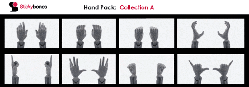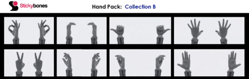 Stickybones がフィギュアとして優れている点は何と言っても関節です。思い切り動かしてもなかなか外れず、それでいて滑らかに自由に動かせます。これによりいつまでも飽きずにいじりながらポージング遊びを楽しみ続けることができます。さらに今回、16 種類という、セット品としてはなかなか他に類を見ない「手」が追加販売されるとのことで、ますます絵のモデルや写真ネタなどに使いやすくなったと感じます。16 種類という数には開発者の異常な情熱を感じます。「この手、一体いつ使うんだろう」というような形の手パーツまで入っていることで、創作における発想の飛躍を起こしてくれることが期待されます。手パーツだけ永久保証がついていないのは指の細さゆえに致し方ないかなと思います。