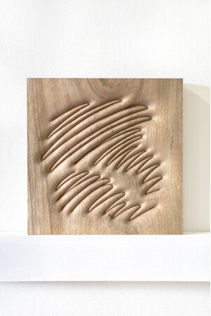 最近では、文字や記号のような決まりのある形ではなく特定の意味を持たない線に着目しており、即興性のある乱雑な線や単調な線を彫った新たなレリーフ作品を発表します。ぜひ会場にてご覧ください。