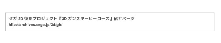 株式会社セガゲームス コンシューマ・オンライン カンパニーは、ニンテンドー3DS(TM)向けに展開中の「セガ3D 復刻プロジェクト」第 15 弾となる最新作、ニンテンドー3DS『3D ガンスターヒーローズ』を2015年6月24日(水)に配信することを決定いたしました。