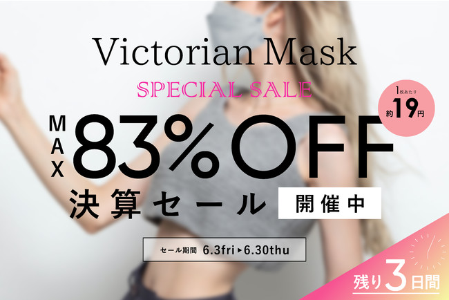 サムライワークス株式会社(代表取締役社長:新島 実 本社所在地:東京都渋谷区)は、累計販売数5,000万枚以上を突破している、肌にやさしく、息がしやすい、メイクが付きにくい、小顔に魅せる美しいフェイスラインで、最高の品質の毎日を笑顔にするマスク 「Victorian Mask(ヴィクトリアンマスク)」のMAX83%OFFおトクな期間限定決算セールを開催いたします。