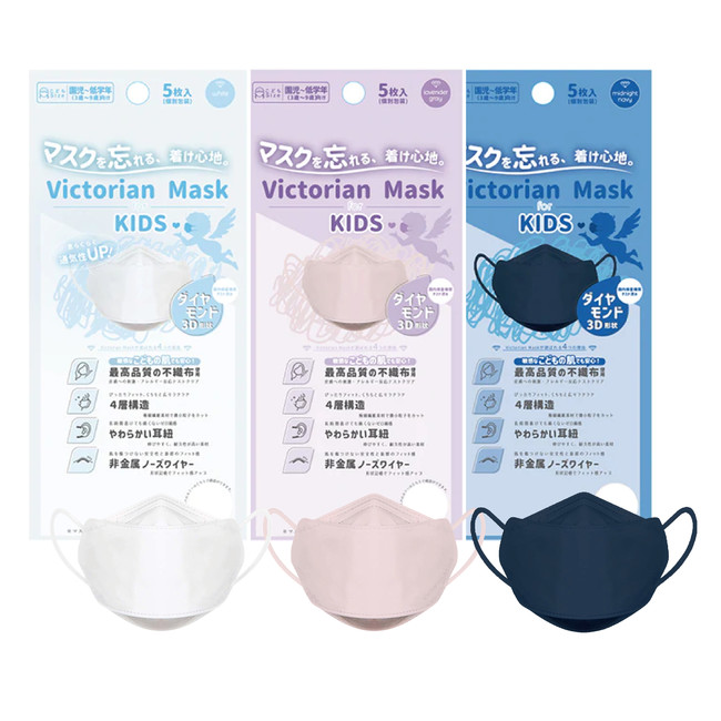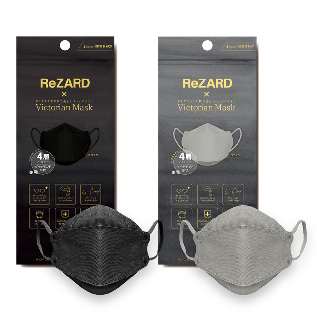 約0.1?(マイクロメートル)サイズの粒子を99.9%ろ過(捕集)できる、人体工学的な設計に基づいた新形状"ダイヤモンド形状"『Victorian Mask』は、マスク着用時のメガネの曇りや息苦しさ、口元のリップ付着などを解消いたします。