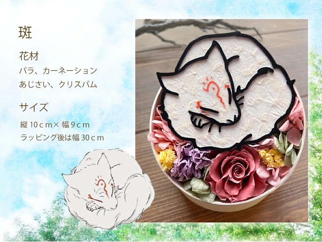 今回登場したウリ坊バージョンのニャンコ先生のフラワーBOXは、ニャンコ先生&黒ニャンコ、ニャンコ先生の本来の姿である「斑(まだら)」に続く第3弾として登場したもの。今回も枯れないお花であるプリザーブドフラワーの花びらを一枚ずつ貼り合わせて、貼り絵のように表現しています。