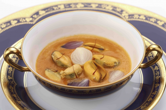 今年のクリスマスメニューのテーマは、「クラシカルフレンチ」。長年愛されてきた正統派フレンチをピトレスク流にアレンジした逸品が揃います。クリスマス特別コース全てに含まれる「オマール海老のカクテルソース 季節の根菜のマセドワンヌ」はオマール海老を主役に、クリスマスらしく紅芯大根など赤、緑、白の大根を添えました。冬に甘みが増す大根の爽やかな風味が海老の旨みを引き立てます。また「ムール貝のスープ サフラン風味」は、モン・サン・ミッシェル産のムール貝の旨みに、豆乳のコク、オリーブオイルの香りが加わった濃厚なスープ。クリームやバターを敢えて使わず、「身体にやさしく、美味しいものを」というシェフの気配りが嬉しい一品です。3種類の特別コースには、他にもアンコウやグジ(甘鯛)、エゾシカなど冬の味覚を取り入れたメニューが揃います。お好みで選べるデザートのワゴンサービスには、ブッシュドノエルが登場します。