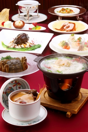 広東料理がベースの本格中国料理に、クリスマスの装いの特別コースが登場。注目はふかのひれや干し貝柱、干しナマコなど高級食材の旨みを数日かけて引き出したスープ「佛跳牆(フォーティャオチァン)」。「あまりの美味しさに僧侶が垣根を飛び越えて食べにくる」という由来にちなみ、メニュー名「サンタも飛び跳ねる極スープ」と題して提供いたします。上海蟹を紹興酒に漬け込んだ「酔っぱらい蟹」の他、クリスマスのごちそうの代表格「七面鳥」のクレープ包み、トリュフが香る「きのこ焼き飯」、デザートの「チョコレートフォンデュ」など洋風のエッセンスも加わり、通常のコースとはひと味違う、豪華メニュー全8品が揃います。