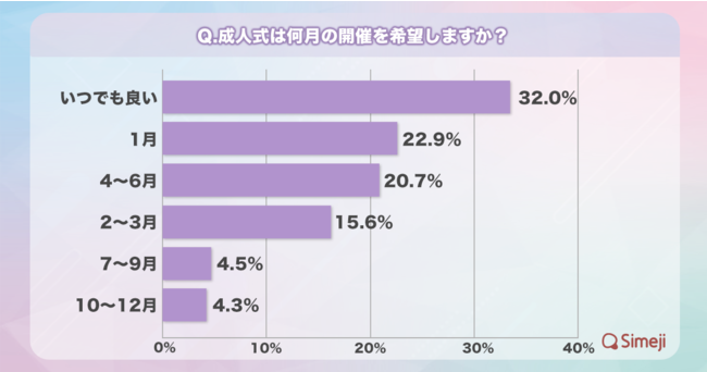 成人式の実施時期は、「いつでも良い(32.0%)」に次いで、「1月が良い」と回答22.9%という