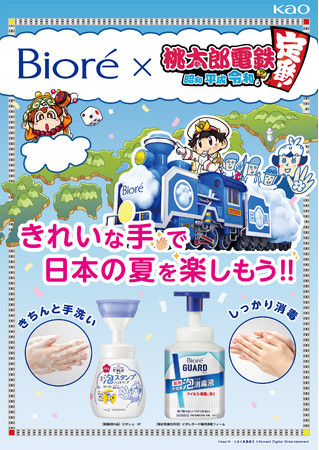 夏のお出かけを思いきり楽しむために、「外出先での消毒」と「帰宅時の手洗い」を忘れずに♪夏休み期間中、全国各地のお出かけスポット、イベントやお祭りに消毒液やハンドソープを提供するほか、「桃鉄フォトスポット」も登場。7月28日からは『桃鉄』ゲーム内に「ビオレコラボ列車」も登場します。お楽しみに♪