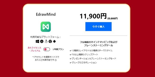こちらは同じエドラ製品でも「マインドマップ」に特化した製品【EdrawMind(エドラマインド)】です。