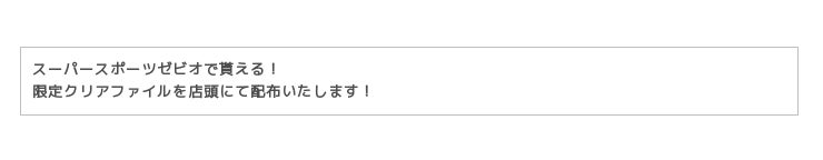 大会当日、会場で配布しているチラシを持参して、会場近隣のスーパースポーツゼビオにご来店頂いた方に大会限定クリアファイルをプレゼント致します。(各店先着100名様)