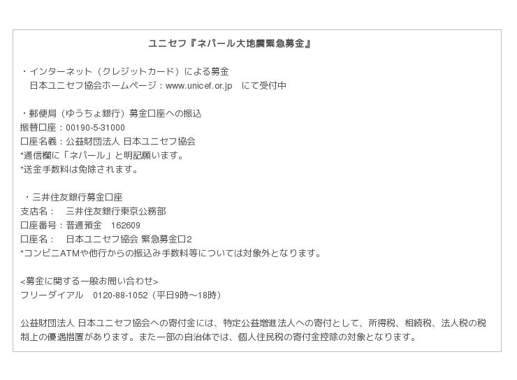 日本ユニセフ協会は、被災地で続く復興支援のため、『ネパール大地震緊急募金』のご支援を受付しております。報道機関の皆様に置きましては、ユニセフ『ネパール大地震緊急募金』の告知へのご協力をお願いいたします。