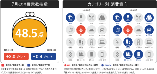 7月の消費意欲指数は48.5点。前月比は+2.0ptの上昇、前年比は-0.4ptの微減となりました。