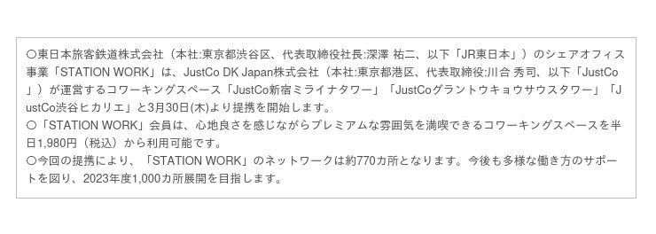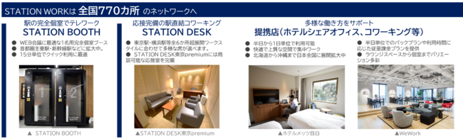 「STATION WORK」は、2019年8月にサービスを開始したJR東日本のシェアオフィス事業です。個室ブース「STATION BOOTH」や、コワーキング等を始めとするワークプレイスを提供することで、多様化する働き方をサポートし、ソリューションを提案していきます。今回の「JustCo」との提携により、日本全国約770カ所のネットワークとなります。