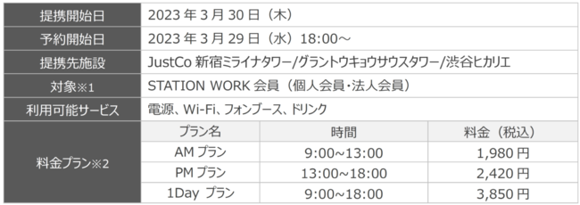 ※2 プラン詳細はSTATION WORK専用WEBサイトをご覧ください。支払方法はSTATION WORK専用WEBサイト登録済クレジットカードによる事前決済となります。
